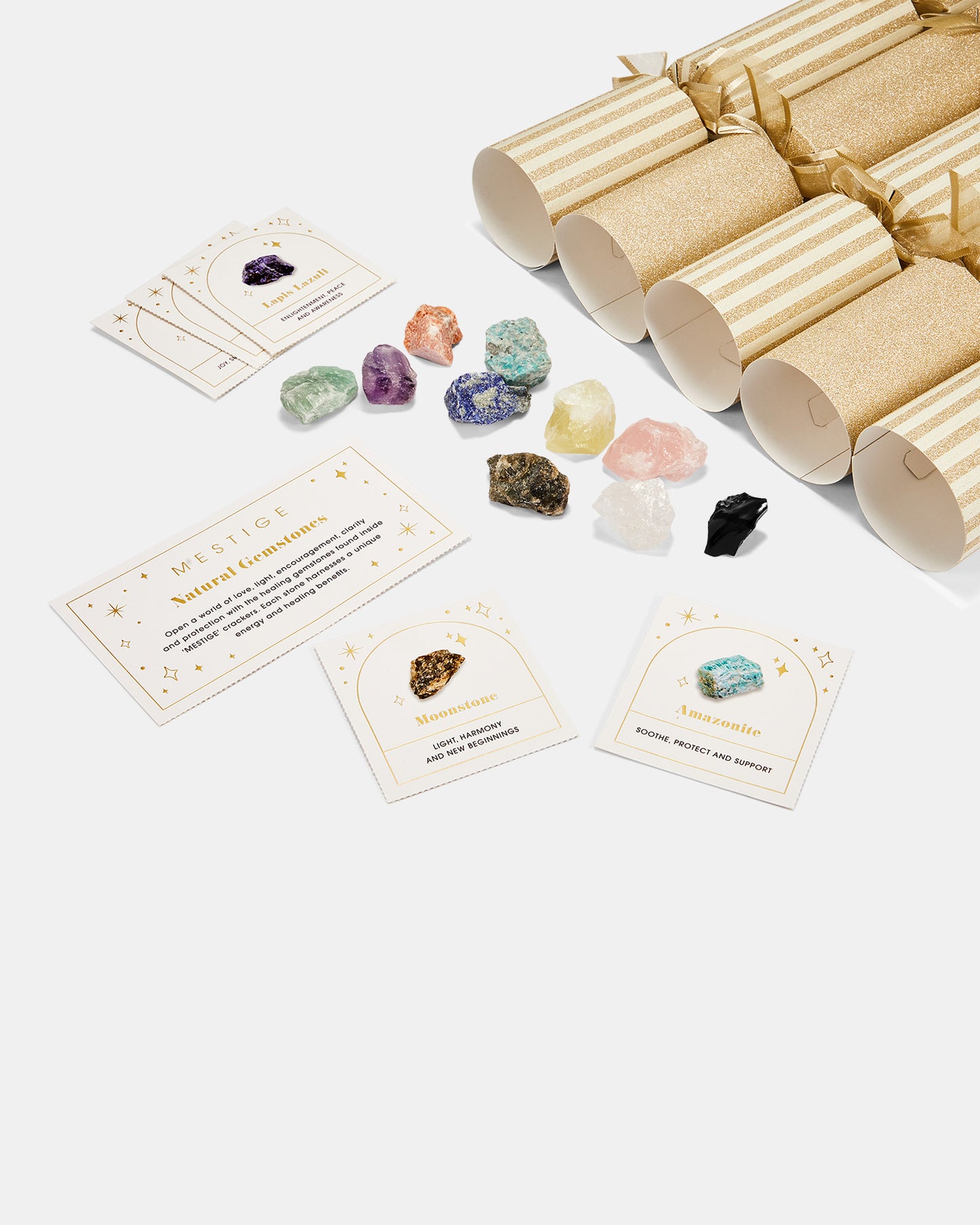Ground your inner self this festive season with the Mestige Natural Gemstone Crackers. Inside each barrel is a powerful stone to strengthen your positivity throughout the day. These stones are perfectly sized to be carried daily, offering support for balance, healing and protection.