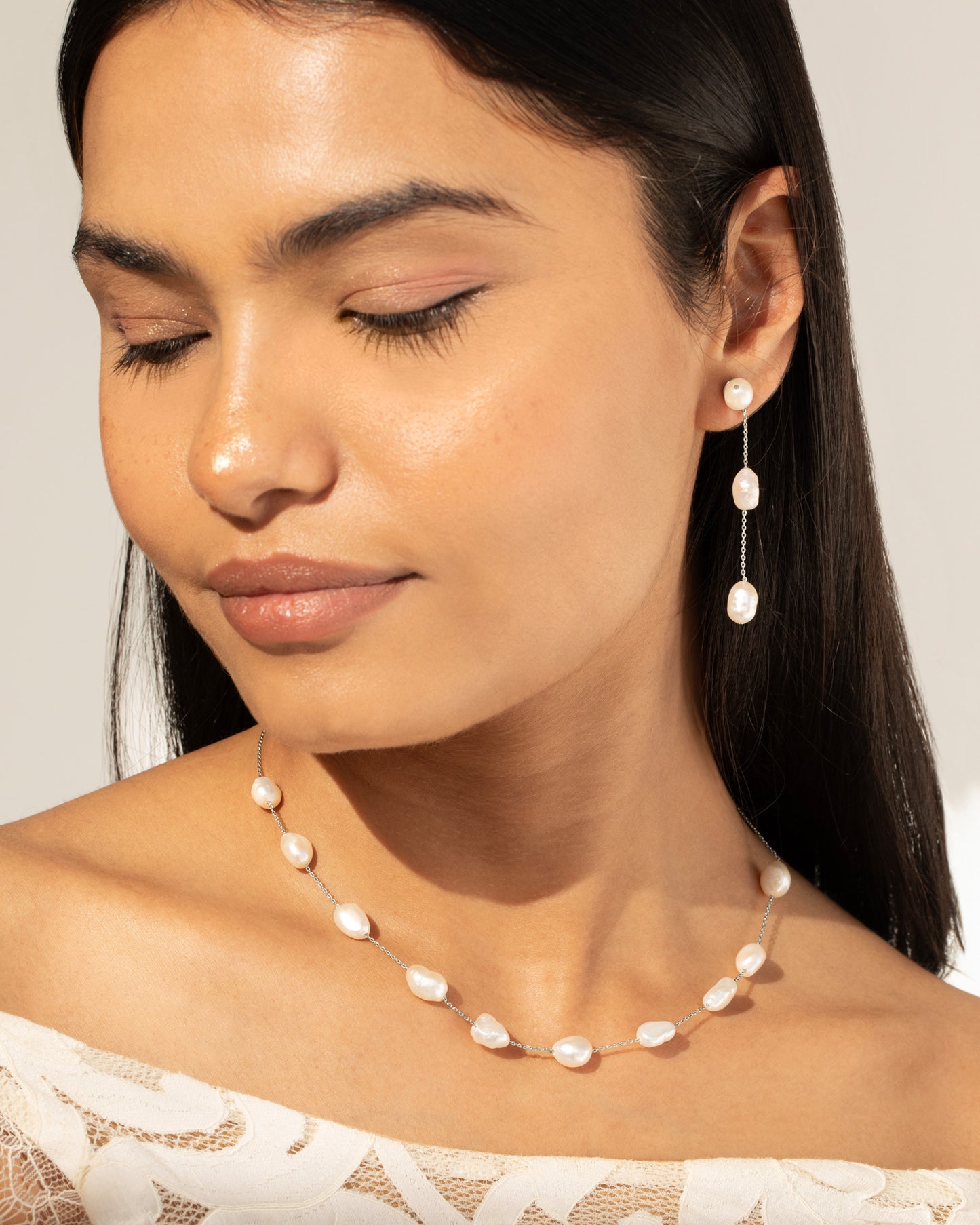 The Monaco Pearl Drop Necklace by Mestige features 11 exquisite freshwater pearls on a delicate chain, adding timeless elegance to any bridal ensemble. Each piece is thoughtfully presented in an elegant champagne-hued gift box, making it the perfect treasure for your special day.
